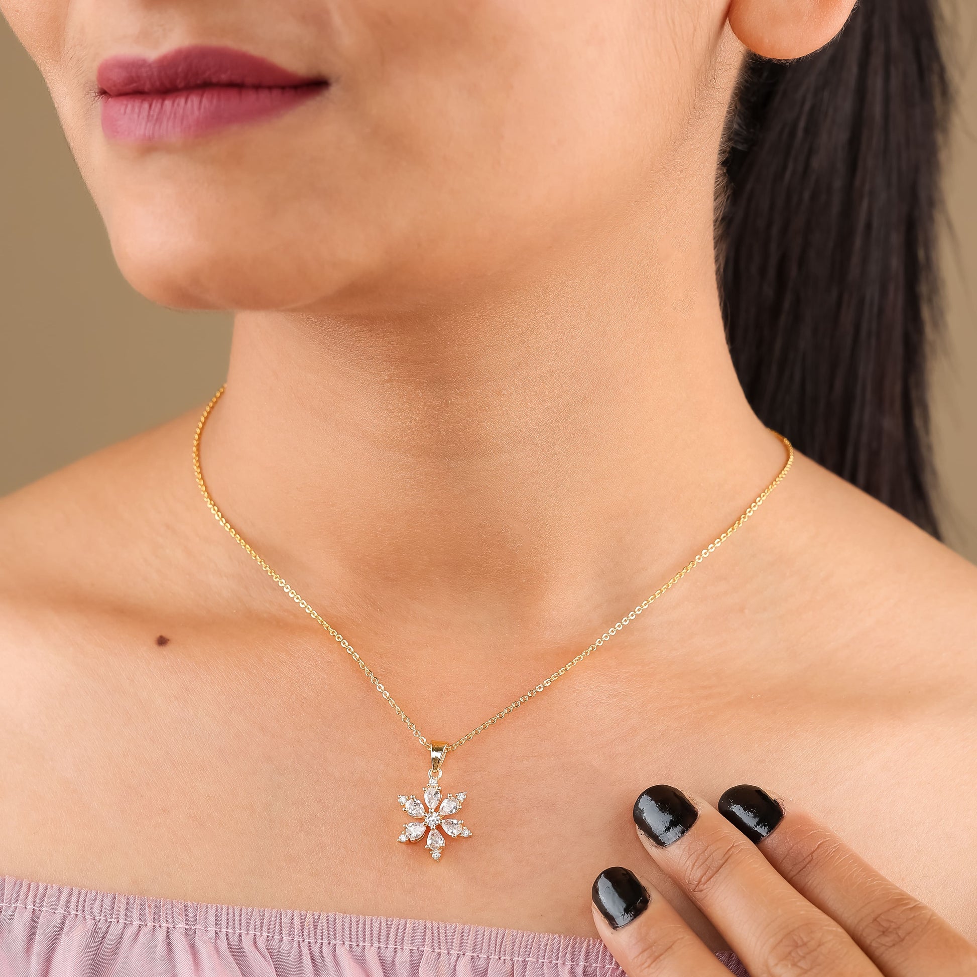 Step into the spotlight with the Elara Blossom Pendant Necklace, a radiant piece inspired by the delicate beauty of blooming flowers. Crafted in a rich gold-tone finish, this necklace features a dazzling floral-shaped pendant adorned with pear-cut cubic zirconia stones that shimmer with every movement. The six-petal design radiates symmetry, grace, and timeless charm.