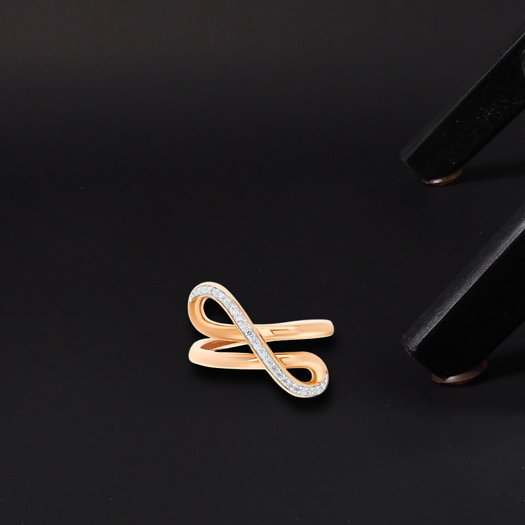 This exquisite ring showcases a graceful infinity design, beautifully adorned with shimmering stones. The rose gold band enhances its luxurious appearance, making it a timeless piece for any jewelry collection.