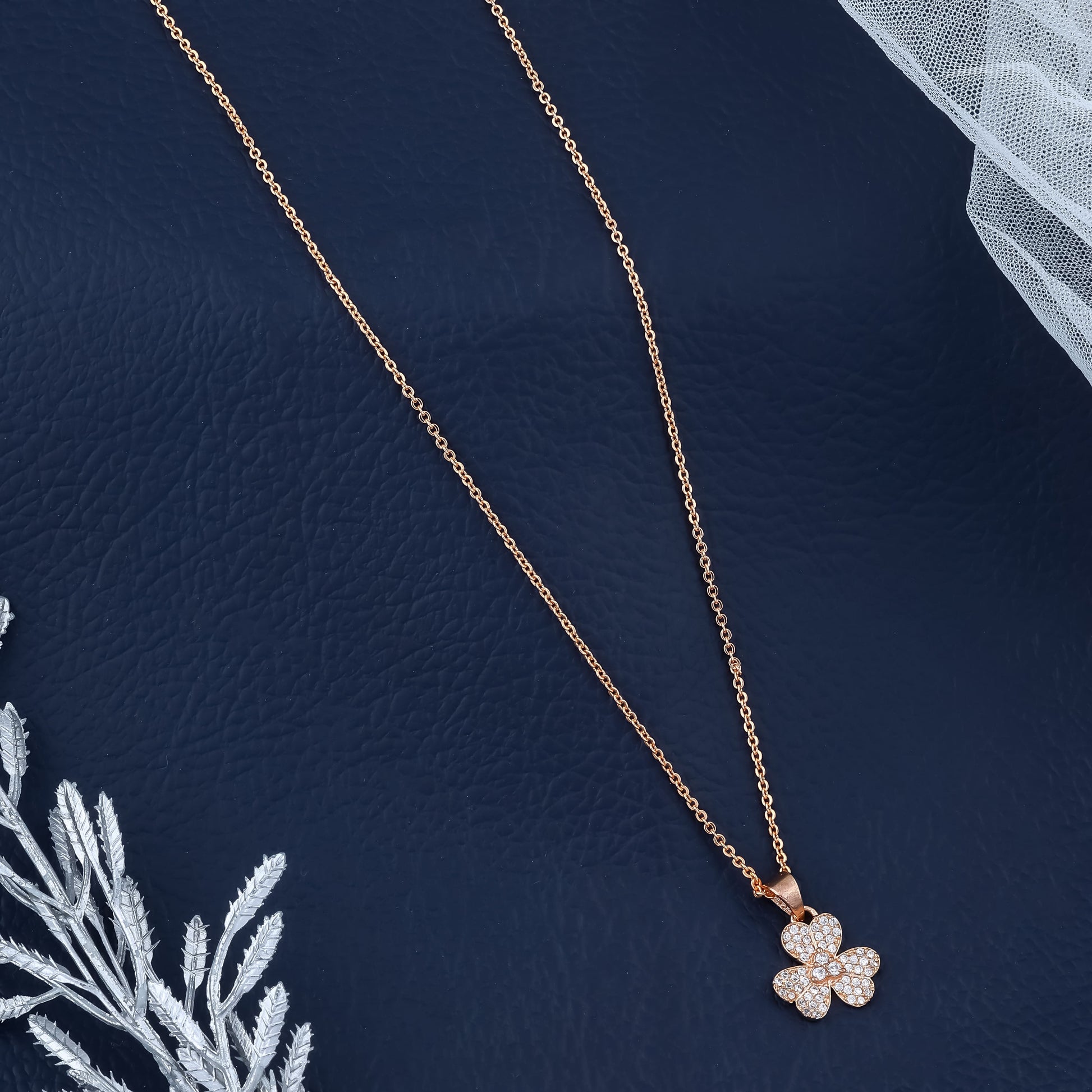 Embrace charm and elegance with the Lyria Clover Sparkle Pendant Necklace. This delightful piece features a four-leaf clover pendant crafted in a luxurious rose gold finish and encrusted with brilliant white cubic zirconia stones. Each heart-shaped leaf glistens with a pavé setting, symbolizing luck, love, and timeless beauty.