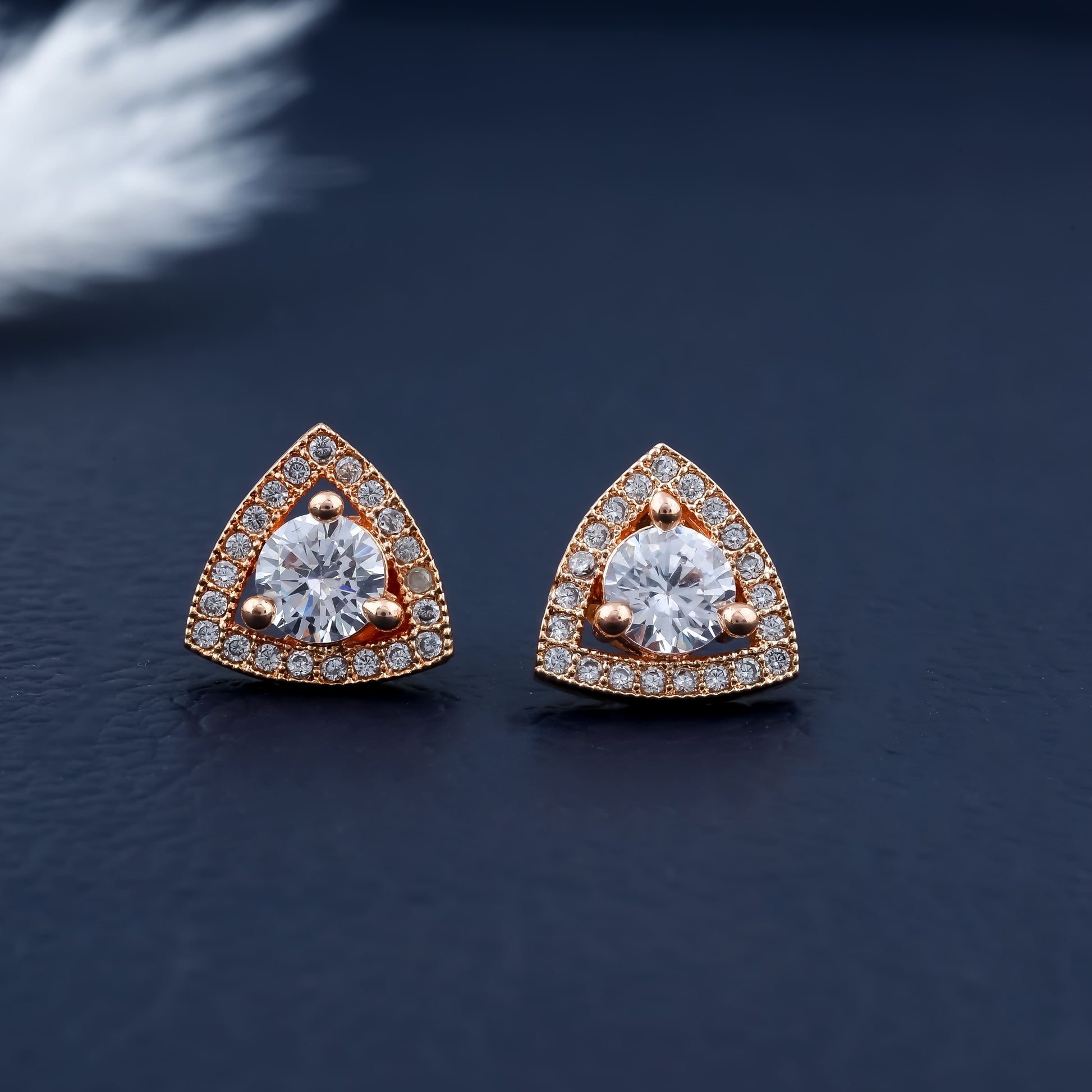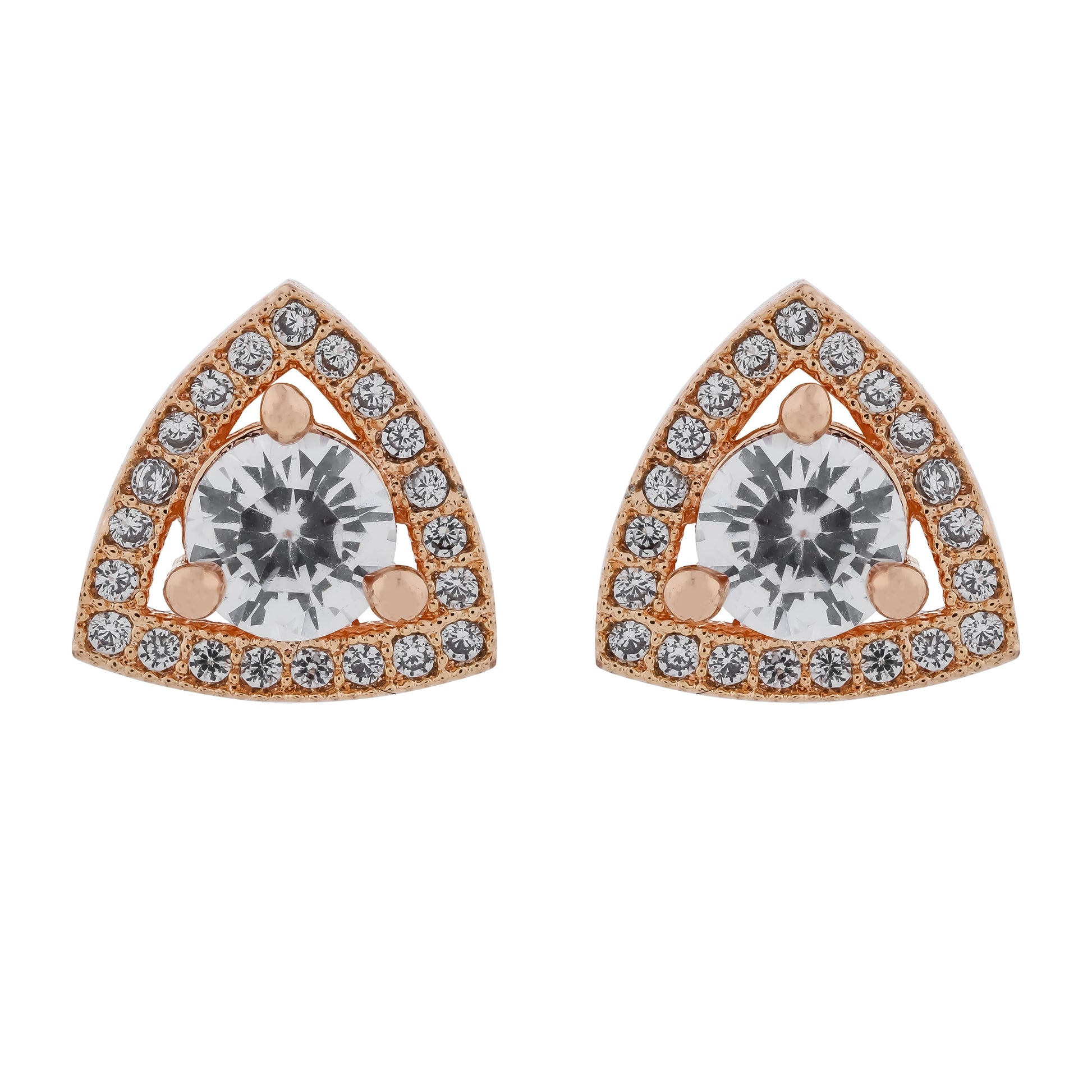 Royal Trillia Studs feature a striking triangular frame embellished with a halo of shimmering crystals, centered around a bold, radiant stone.